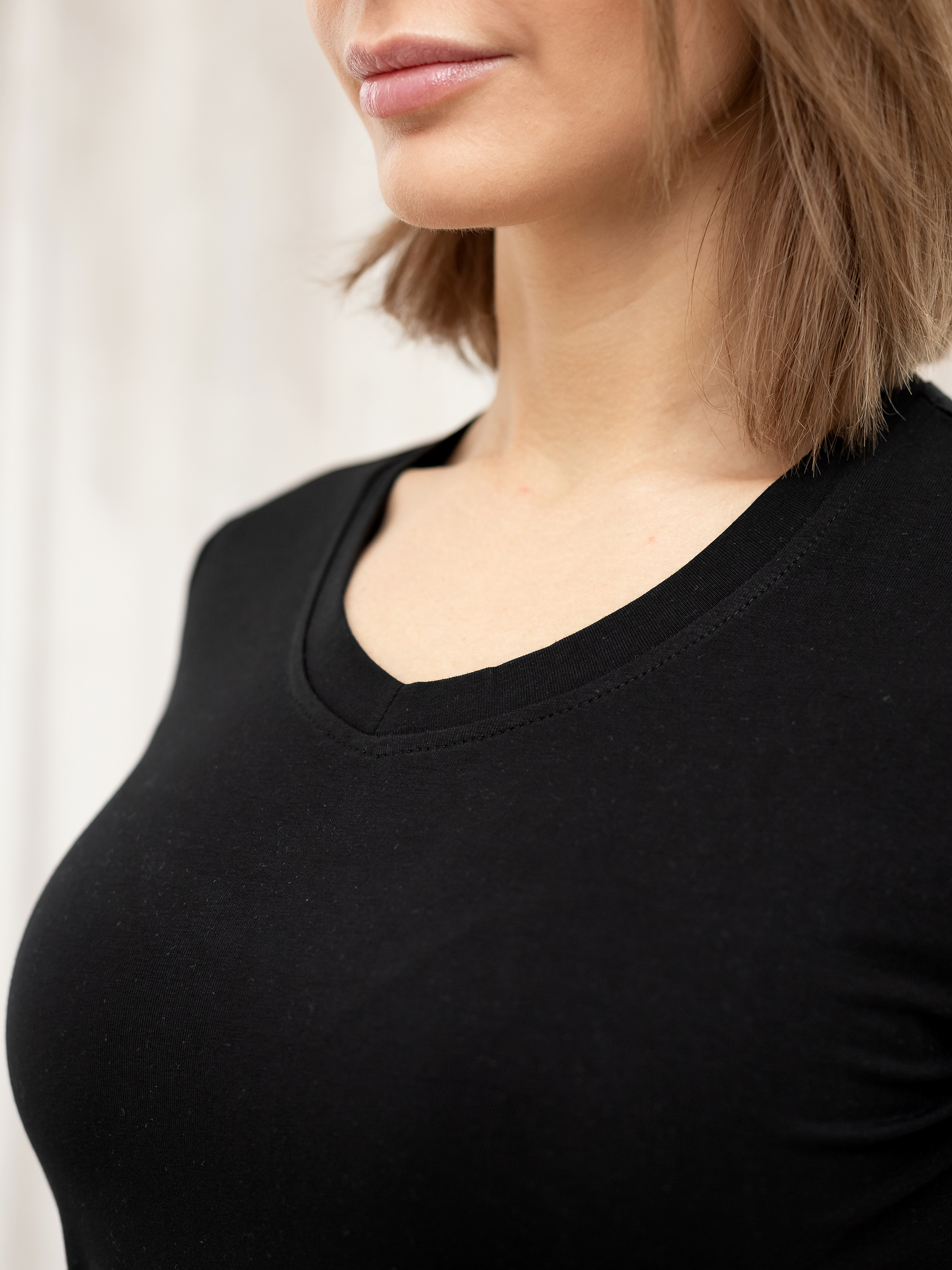 V-образный вырез горловины, не глубокий.
